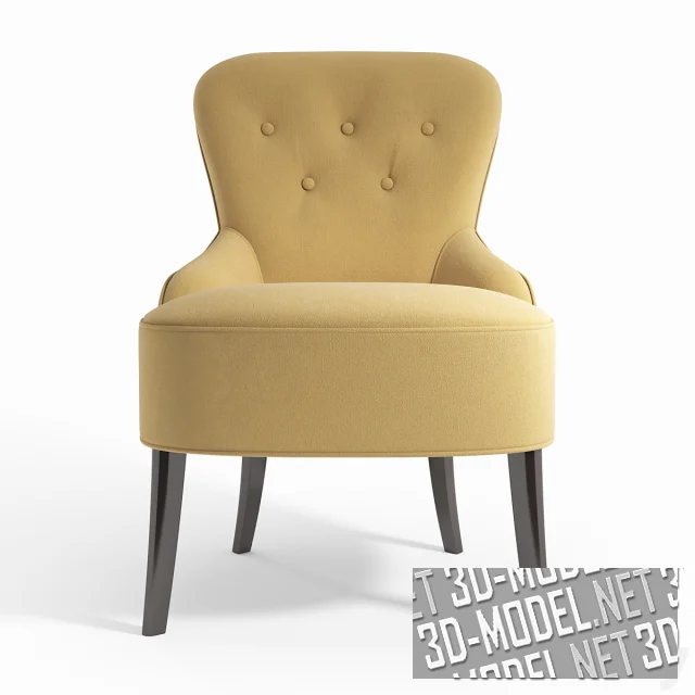 Бледно-желтое полукресло в стиле нео-классика Remsta от IKEA. Спинка со скругленными углами сопрягается с толстым сиденьем небольшими треугольными «подлокотниками». Спинка декорирована пятью пуговками-втяжками. Корпус смонтирован на черных деревянных ножках. Габарит кресла: 60х66х88см.