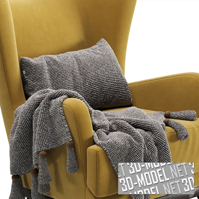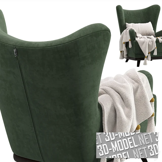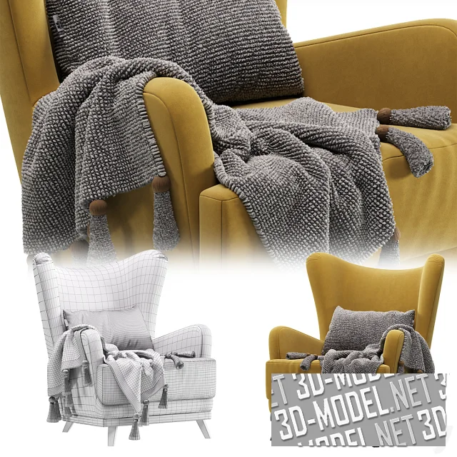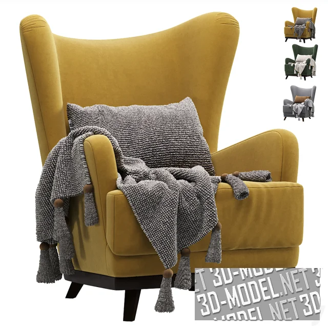 Классическое кресло с высокой спинкой и скругленными выступами в верхней части - Oxford от Divan.ru. Вогнутая спинка, переходящая в скругленные подлокотники и толстая подушка сиденья обиты велюром (горчично-желтого, темно-зеленого и светло-серого цветов). Мягкие элементы смонтированы на черной деревянной раме с невысокими, слегка расставленными ножками. Дополнено декоративными подушками и пледами с кистями по коротким сторонам. Габарит кресла: 80х100х98см.
