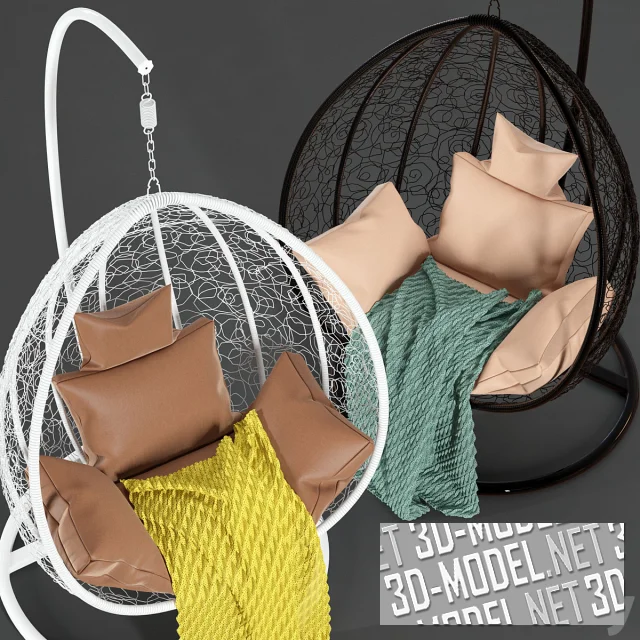 Кресло-качели «кокон» Fresco Maxi, подвешиваемое на металлической подставке с круглой площадкой. «Кокон» напоминает половинку физалиса, с ажурным проволочным заполнением плоскости и оплеткой каркаса из искусственного ротанга. Представлено два варианта кресла: черный и белый. Габарит корзины: 110х73х117см. Габарит стойки: 103х103х195см. Кресло дополнено разновеликими подушками в бежевых чехлах и желтым текстурным пледом.