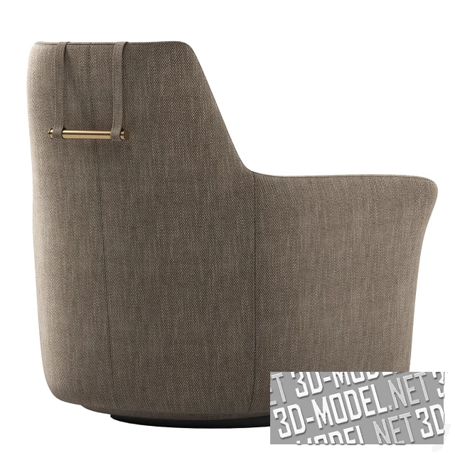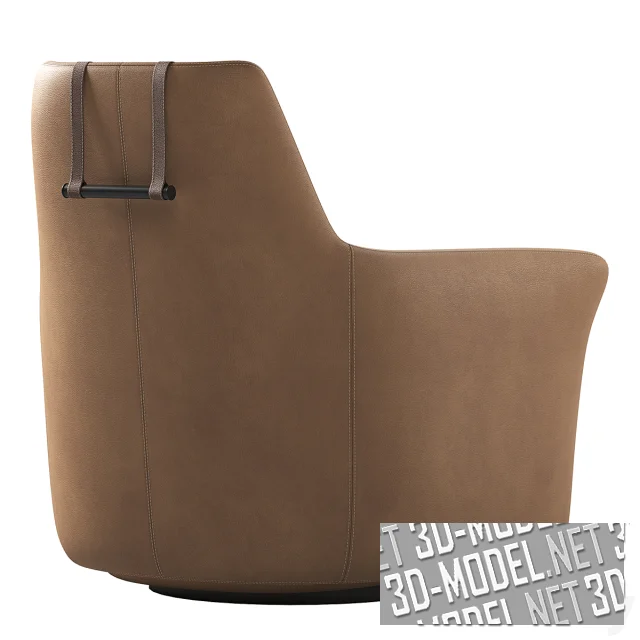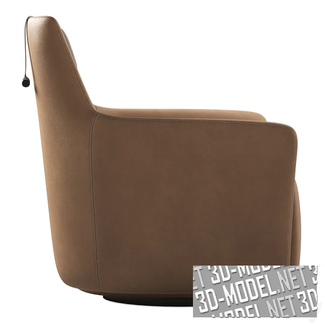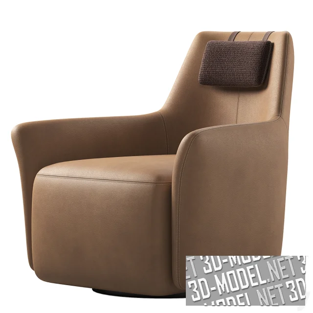Представлено два варианта отделки кресла. Первый: крупнотекстурный текстиль цвета льняного холста. Второй: светло-коричневая кожа с двойной декоративной прострочкой, дублирующей швы и подушкой подголовника в чехле из темно-коричневого текстиля в мелкую рельефную клетку. Габарит кресла: 88х90х96см.