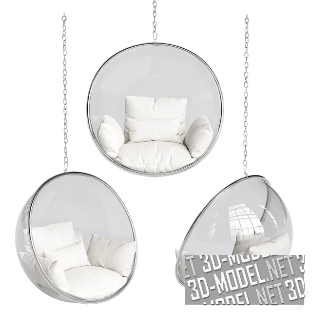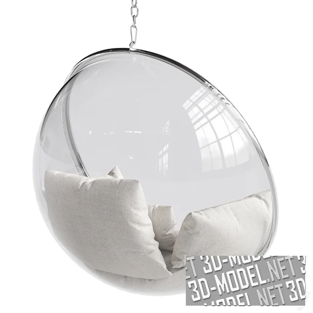 Современное подвесное кресло Bubble от финского дизайнера Eero Aarnio. Кресло сделано из прозрачного акрила в виде полусферы, подвешенной на трехметровой серебристой цепочке. Внутри полусферы уложены белые мягкие подушки сиденья, подлокотников, спинки и дополнительной горизонтальной подушки в тканевых чехлах. Габарит кресла: 103х70см.
