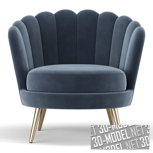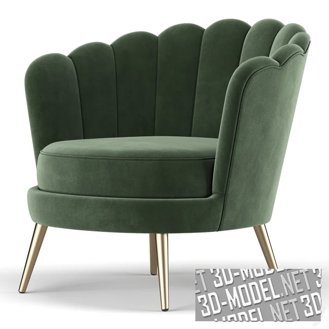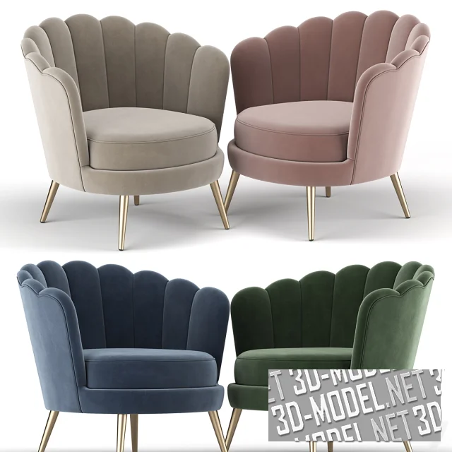 Современное кресло в стиле арт-деко - модель Barrel от Demers. Основание круглого сиденья базируется на четырех золотистых ножках. Огибающая спинка состоит из ряда вертикальных сегментов с закруглениями сверху. Велюровая обивка представлена в четырех цветах: слоновая кость, пудровый (бледно-розовый), синий, темно-зеленый.