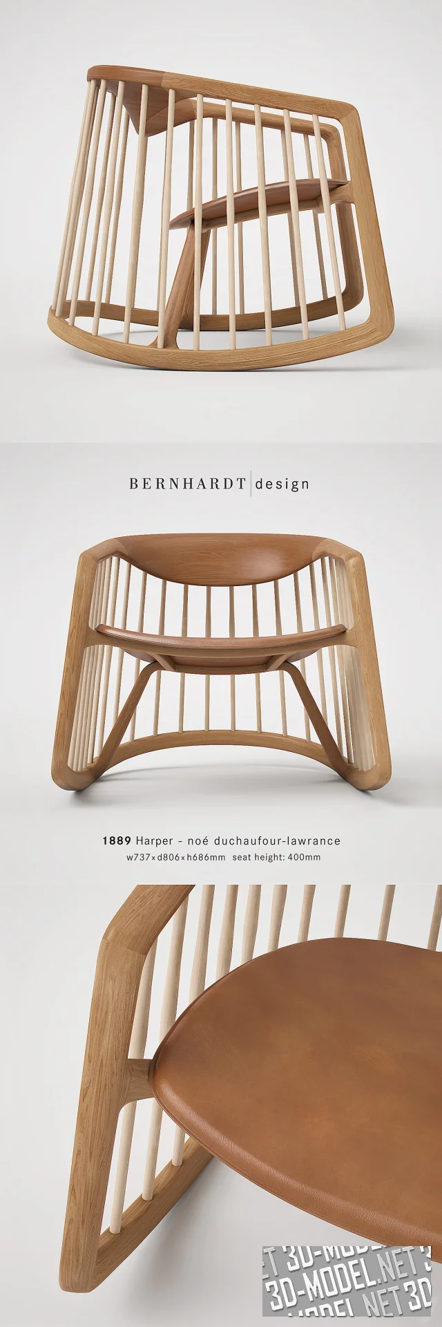 Невысокое деревянное кресло-качалка - Harper от Bernhardt Design. Габарит кресла: 73,7х80,6х68,6см. Огибающая спинка с плавными скруглениями выполнена в виде деревянной рамы, заполненной деревянной решеткой из вертикальных элементов круглого сечения, более светлых, чем рама. Чуть вогнутое сиденье обито охристой кожей с небольшим слоем пенополиуретана.