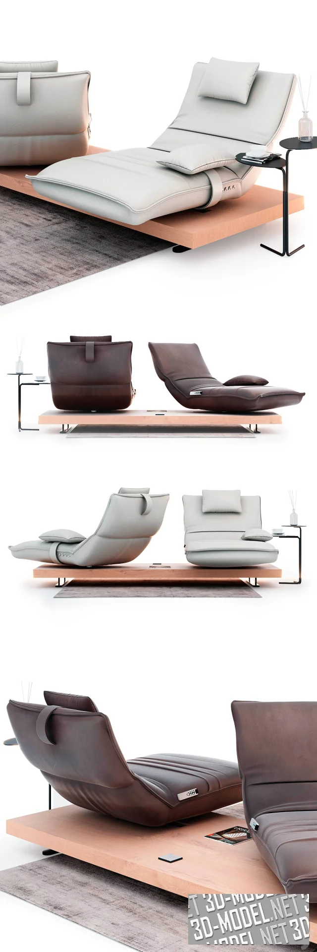 Обивка представлена в двух вариантах: коричневая и белая кожа. Модели дополнены двухъярусным приставным столиком на черной гнутой трубчатой опоре. На поверхности журналы, белая чашка, аромо-диффузор с палочками в стеклянном плафоне.