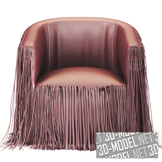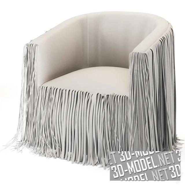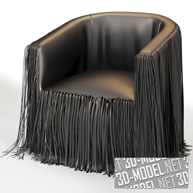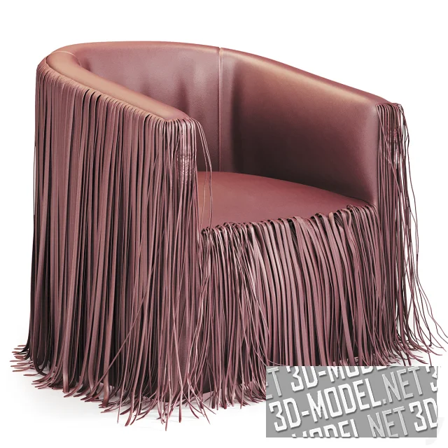 Современное вращающееся кресло Shaggy в коже NeKeia от Ngala trading. Скругленная огибающая спинка переходит в подлокотники. Кресло обито кожей ручной отделки, произведенной в Южно-Африканской Республике (Johannesburg). Наружная плоскость украшена длинной ниспадающей бахромой из той же кожи, что и обивка. При этом ширина полосок бахромы, расположенной под ногами сидящего - чуть шире, чем остальных. Представлена кожа трех цветов: красно-коричневая, белая, черная.