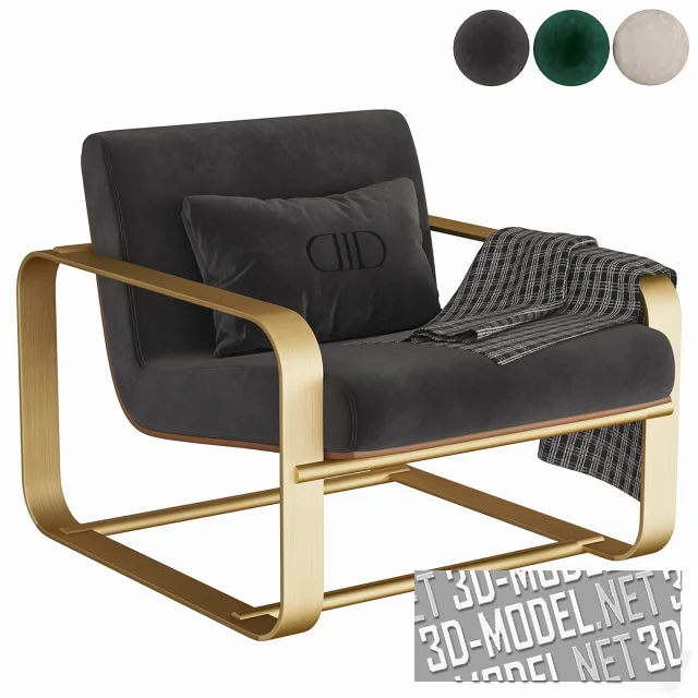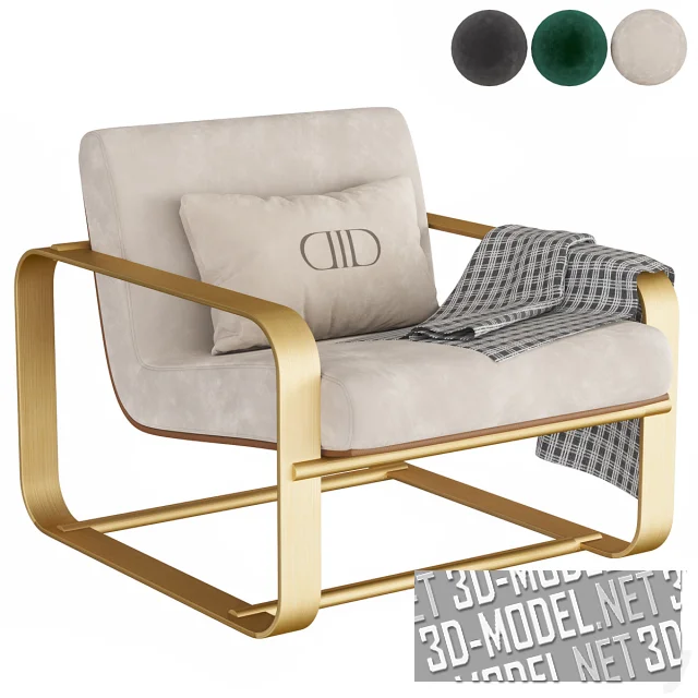 Обивка мягких элементов представлена в трех вариантах велюра: черно-серый, темно-зеленый и «слоновая кость». Кресло дополнено небольшой прямоугольной подушкой в чехле из материала обивки с логотипом производителя и клетчатым пледом. Габарит Giza: 72х78х66см.