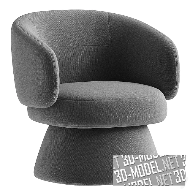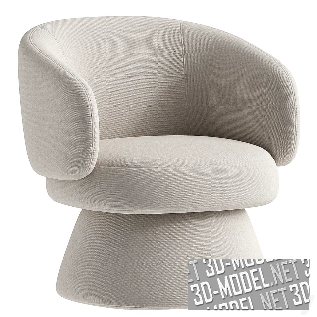 Круглое современное вращающееся кресло Eyr от Dantone Home. Опора выполнена в виде массивного конуса со срезанной вершиной. Огибающая скругленная спинка переходит в скругленные подлокотники. Обивка всех элементов (крупнотекстурный текстиль) представлена в трех вариантах: белый, темно-серый, умбра.