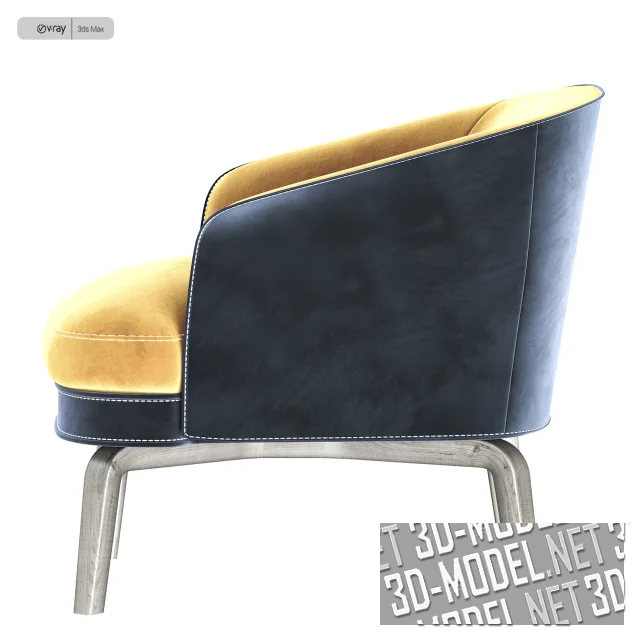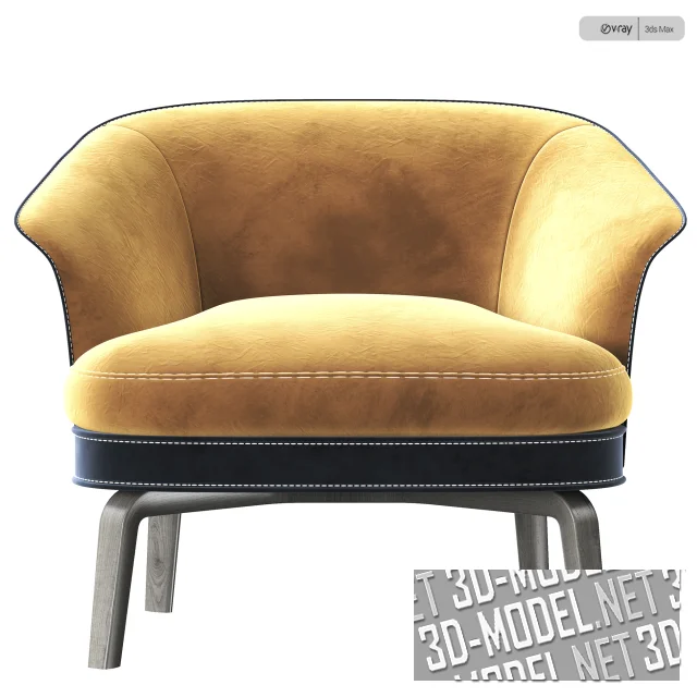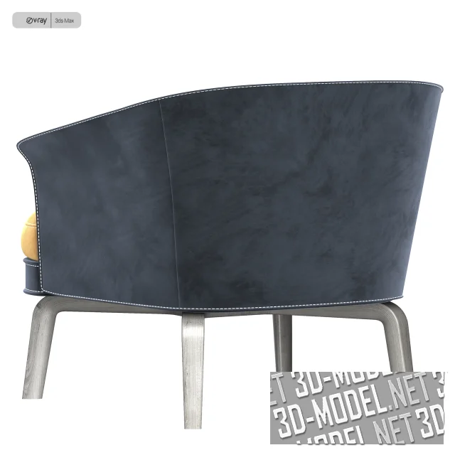Roberto Lazzeroni). Низкая огибающая спинка, переходящая в подлокотники и мягкое сиденье кресла обиты седельной кожей Pelle Frau® с декоративной контрастной прострочкой швов. Корпус смонтирован на деревянной крестовине с ножками.