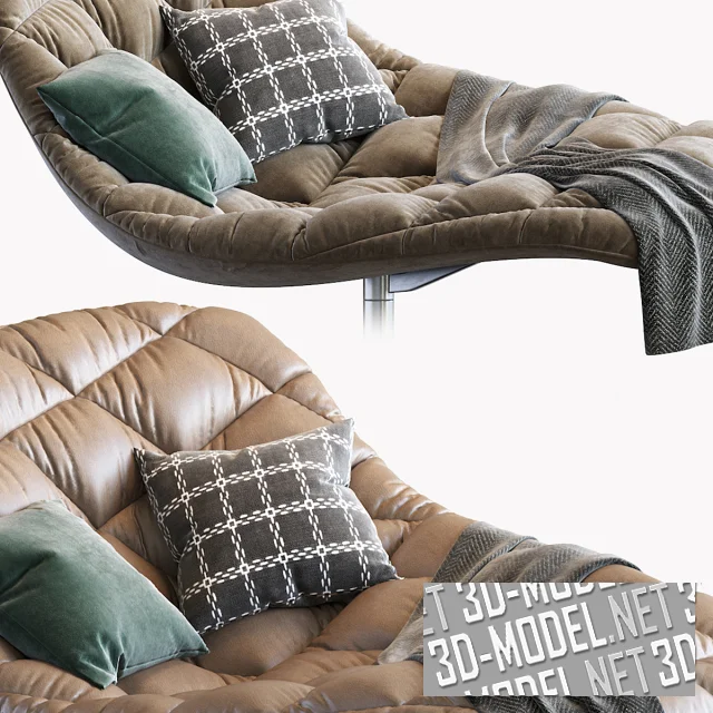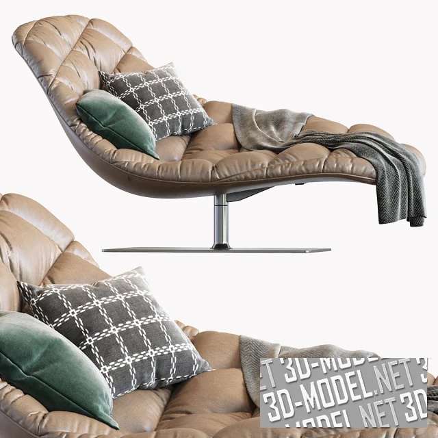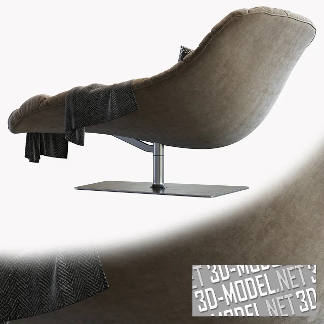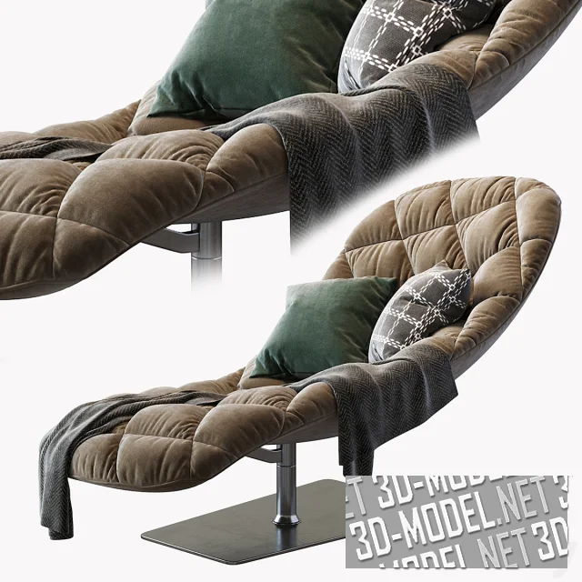 Patricia Urquiola, 2008 г.). Бохо-шезлонг с удлиненным мягким корпусом, декорированным прострочкой с крупными квадратными элементами, имеет скругленный криволинейный асимметричный силуэт. Форма позволяет сидеть и спустив ноги, и лежа, положив ноги на мягкую обивку. Металлическая серебристая опора смонтирована на прямоугольной металлической плите, обеспечивающей креслу устойчивость и надежность.
