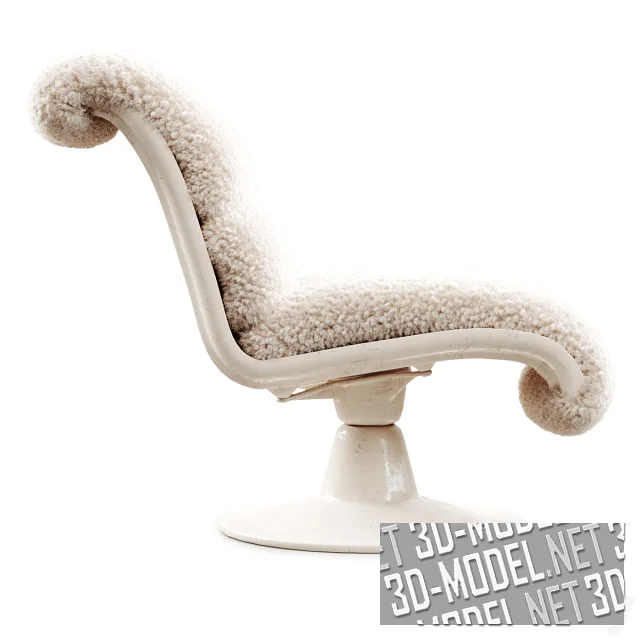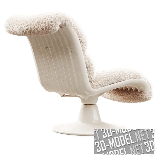 Белое поворотное кресло Saturn от дизайнера Yrjo Kukkapuro (Финляндия). Основа без подлокотников - жесткие элементы из стекловолокна с белой отделкой. Мягкое сиденье и спинка с отворотом назад обиты светло-бежевой кудрявой овчиной. Массивная опора из стекловолокна - с круглой площадкой.