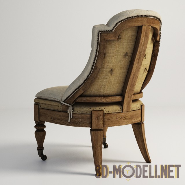 3d модель кресла KEMPER DECONSTRUCTED 603.006-F01 от производителя мебели Gramercy Home. Небольшое кресло, выглядит, как будто из музея – с внешностью сурового средневекового вельможи. Массивное основание и каркас спинки сделаны из натурального дерева, подушка на сиденье и спинка – из льняного полотна. Спинка с мягкой каретной обивкой капитоне, пробита по краю декоративными гвоздиками с медными шляпками. Передние ножки кресла точеные, на латунных рояльных роликах. Задние слегка изогнуты, что придает модели легкости. На задней плоскости спинки и под подушкой просматривается обивка мешковиной, умышленно небрежно пробитая гвоздиками по периметру сиденья. Качественная модель с текстурами и материалами.