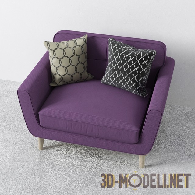 3D-модель небольшого мягкого кресла, обтянутого тканью сиреневого цвета. Кресло дополнено двумя серо-черными декоративными подушками. Модель со всеми текстурами.