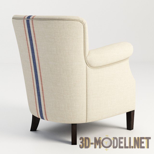 Кресло «ROLAND», артикул 602.019-GP06, производство американской компании Gramercy Home. Кресло отличается оригинальным дизайном, в котором органично сочетаются винтажные элементы, вроде декоративных гвоздиков из латуни и льняной обивки, и стильной полосы по центру кресла. Модель имеет следующие размеры: