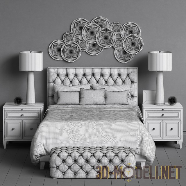 Двуспальная кровать ZGallerie Prague, с тумбами и различным декором в комплекте. Кровать имеет высокую мягкую спинку с утяжкой капитоне. Размеры кровати: 170 x 223.5 x 143.5 см. Размеры тумбочек Concerto: 71 x 56 x 76 см. Скамья Jules Tufted отлично подходит в стилистике кровати. Размеры скамьи: 133 x 56 x 40.6 см. Настольные лампы Centure идеально вписываются в гарнитур, и помогут создать мягкое, уютное освещение. Размеры светильников: 101.5 x 46 см.