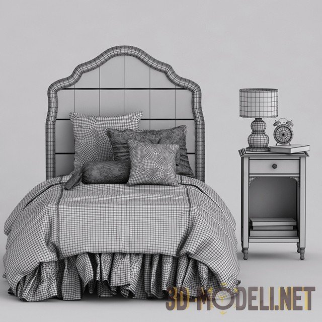 Мебель для детской спальни: кровать с тумбочкой из коллекции Juliette, производства Pottery barn kids, вариант twin. Размер кровати: 106 х 200 см, высота изголовья составляет 137 см. Изголовье имеет изогнутую, ступенчатую форму, что в сочетании с другими деталями позволит создать очаровательную, старинную обстановку. Тумбочка размером 45 x 40 см, высота 70 см. В комплекте постельное бельё Frank and lulu.
