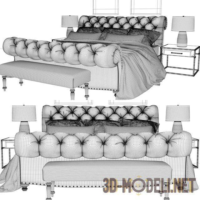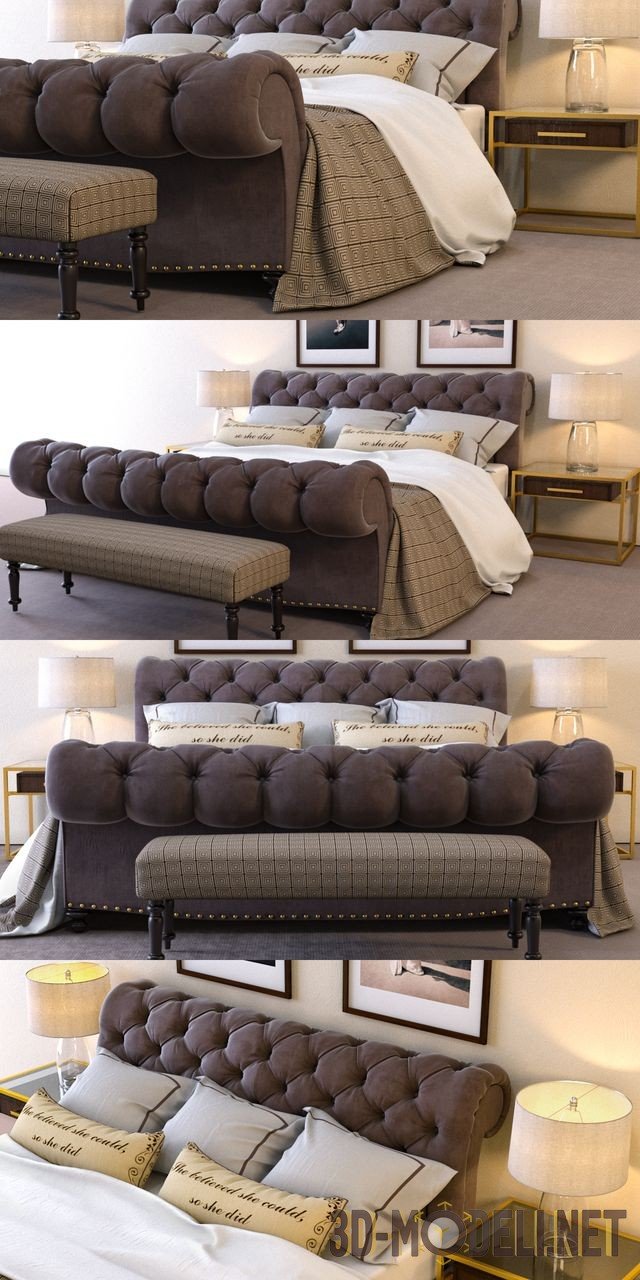Двуспальная кровать Burton Eloise Tufted от Restoration Hardware. Имеет пышные формы. благодаря простеганным изголовью и изножью. В комплекте прикроватная тумба RH Kennan 26 и настольная лампа Arteriors Jamal, которые хорошо гармонируют с основной мебелью.