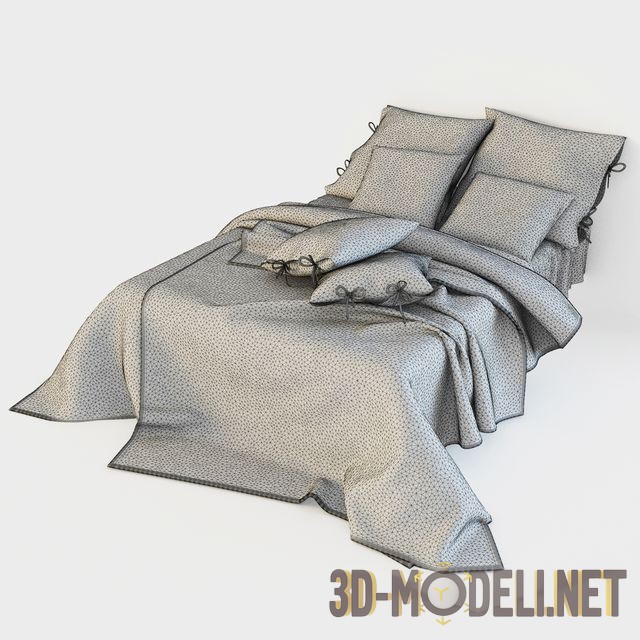 Комплект постельного белья в красно–бежевом сочетании, в современной трактовке этно-стиля. Полотна одеял и чехлы подушек простёганы поперечной строчкой, создавая эффект укрупнённого вельвета. Чехлы на подушках снабжены завязками–бантиками. Две большие подушки, одна маленькая и одно из одеял - карминно–красные. Маленькая подушка и второе одеяло – светло–бежевые. Простыня и ещё две небольшие подушки сшиты из текстиля с густым светло–бежевым принтом в виде стилизованных листиков на карминно–красном фоне.