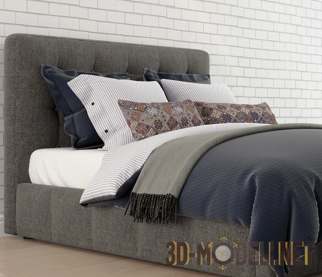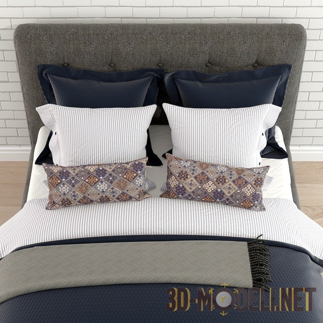 Двухспальная кровать для интерьера современной спальни. Кровать оснащена мягким серым изголовьем. Такой же тканью обит и корпус кровати. Постельное бельё подобрано в этническом стиле: чехлы небольших подушек сделаны из текстиля в марокканском стиле. Остальные элементы (одеяла, покрывало и чехлы более крупных подушек) сшиты из тканей чёрного, серого цветов, а также белой в мелкую полоску. Все ткани отлично взаимодействуют между собой. Размеры кровати: 145 х 244 х 214 см.