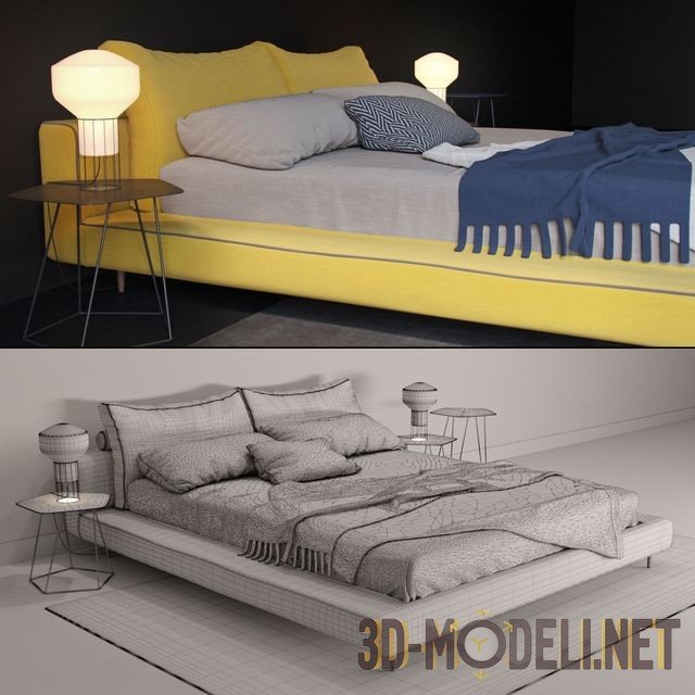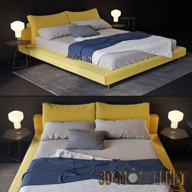 Современная двуспальная кровать от бренда Bonaldo - Qwen. Размер кровати составляет 2130 x 2350 x 820 мм. Этот стильный набор для спальни содержит прикроватные тумбочки Bonaldo Tectonic и светильники Fabbian Aerostat.