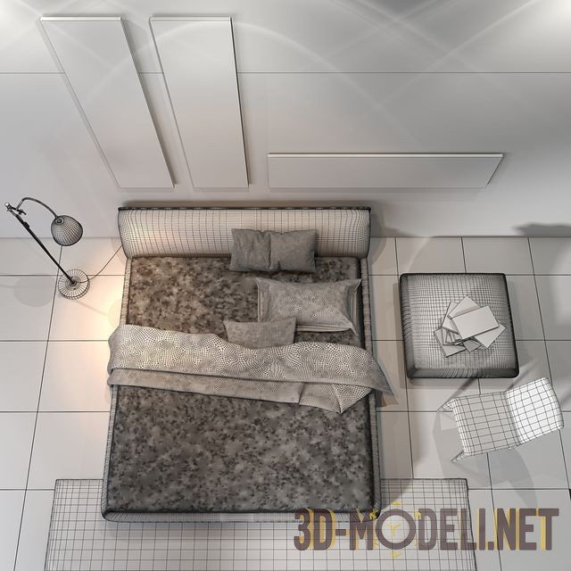 Набор для современного интерьера спальни, комплект мебели от производителя Bonaldo, Италия. Комплект включает в себя двуспальную кровать Bonaldo Amos, размером 239 x 208 x 69 см, пуф Bonaldo Amos (90 x 90 x 28 см) и стул Bonaldo Filly up, размер: 44 x 57 x 90 см. Торшер, картины и стопка книг придают набору удивительную достоверность.