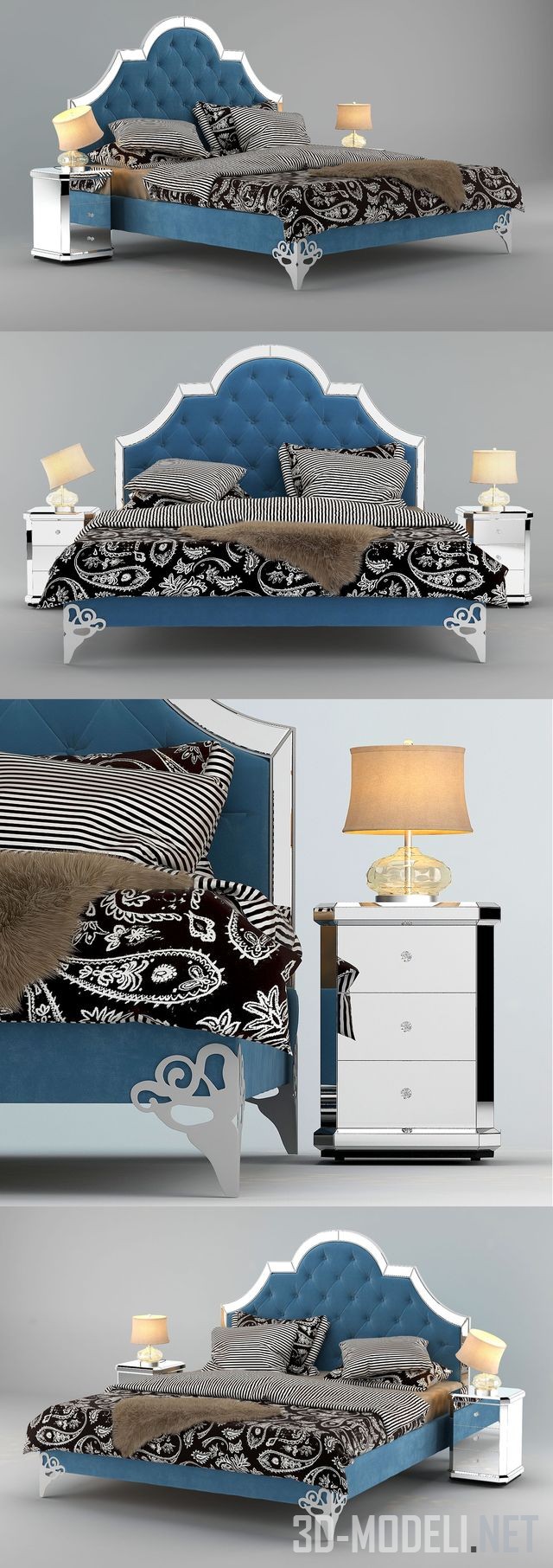 Двухспальная кровать от Garda Decor в стиле арт–деко. Габариты кровати: 1870 х 2075 х 1500 мм. Верх изголовья имеет фигурный симметричный срез, с зеркальной окантовкой. Мягкая плоскость декорирована простежкой капитоне. Обивка изголовья и корпуса выполнены из синего материала. Ножки кровати изготовлены из нержавеющей стали в виде декоративных уголков с орнаментом. Постельное белье пестрое, черно–белое, в мелкую полоску и с орнаментом «турецкий огурец». Сверху наброшена овчина. Пара прикроватных тумб декорированы зеркальными фасадами на выдвижных ящиках. На тумбах – светильники в классическом стиле с абажурами из льняного холста бежевого цвета и основанием из цветного стекла. Наклон плафона можно регулировать.