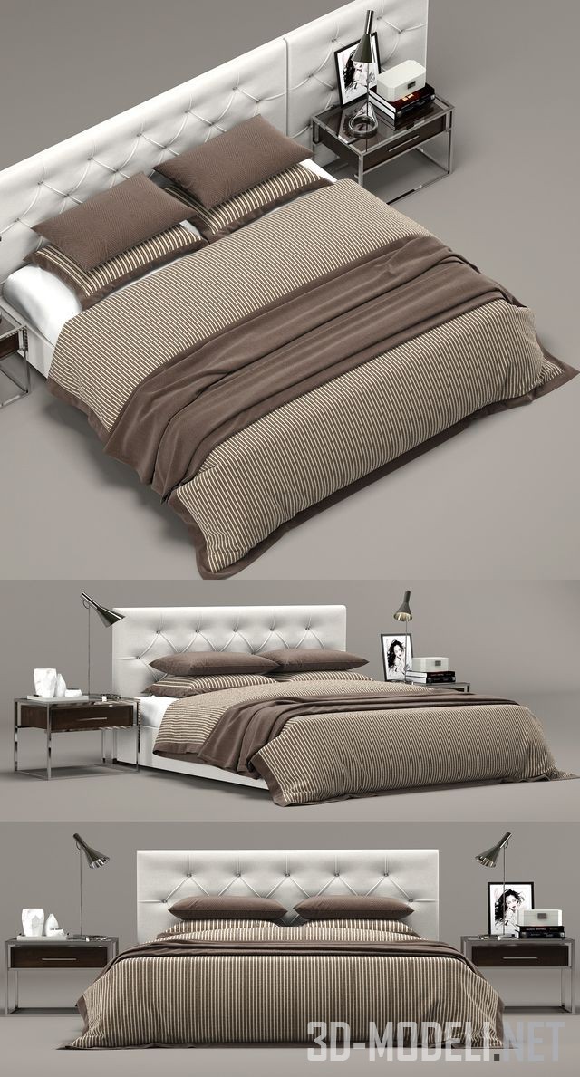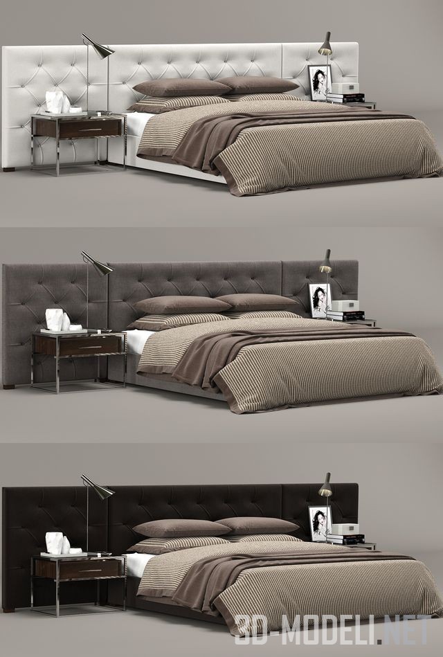 Кровать Diamond tufted и прикроватные тумбы от Restoration Hardware. Особенностью этой кровати в современном стиле является широкая панель изголовья. Мягкая панель состоит из трех соединенных секций, обитых светлым материалом. Поверхность декорирована ромбовидной прострочкой с декоративными гвоздиками. Комплект белья изготовлен из текстиля коричневого цвета и в мелкую коричневую и бежевую полоску. Прикроватные тумбы изготовлены на базе каркасов из нержавеющего металла, с выдвижным ящиком из темного дерева. На тумбах – современные светильники на тонких хромированных ножках и с плафонами из нержавеющего металла (