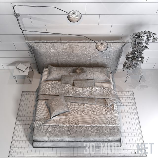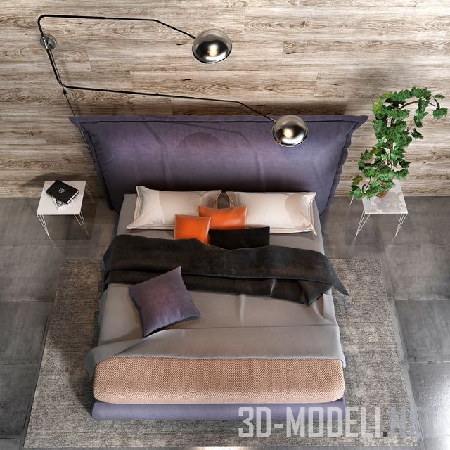 Комплект дополнен прикроватными столиками, настенной лампой и домашним зеленым растением, что существенно оживляет композицию.