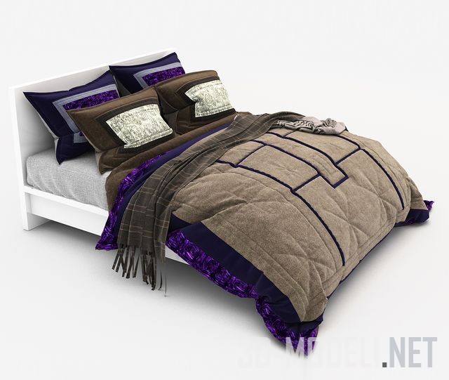 Белая кровать простой конфигурации с прямой спинкой. На кровати лежит толстое коричневое стеганое одеяло, подбитое сиреневым бархатом. Такие же бархатные вставки на двух подушках в изголовье кровати, а две другие - коричневого цвета с блестящими парчовыми бежевыми вставками. Поверх одеяла небрежно брошены два узких тонких пледа с бахромой.