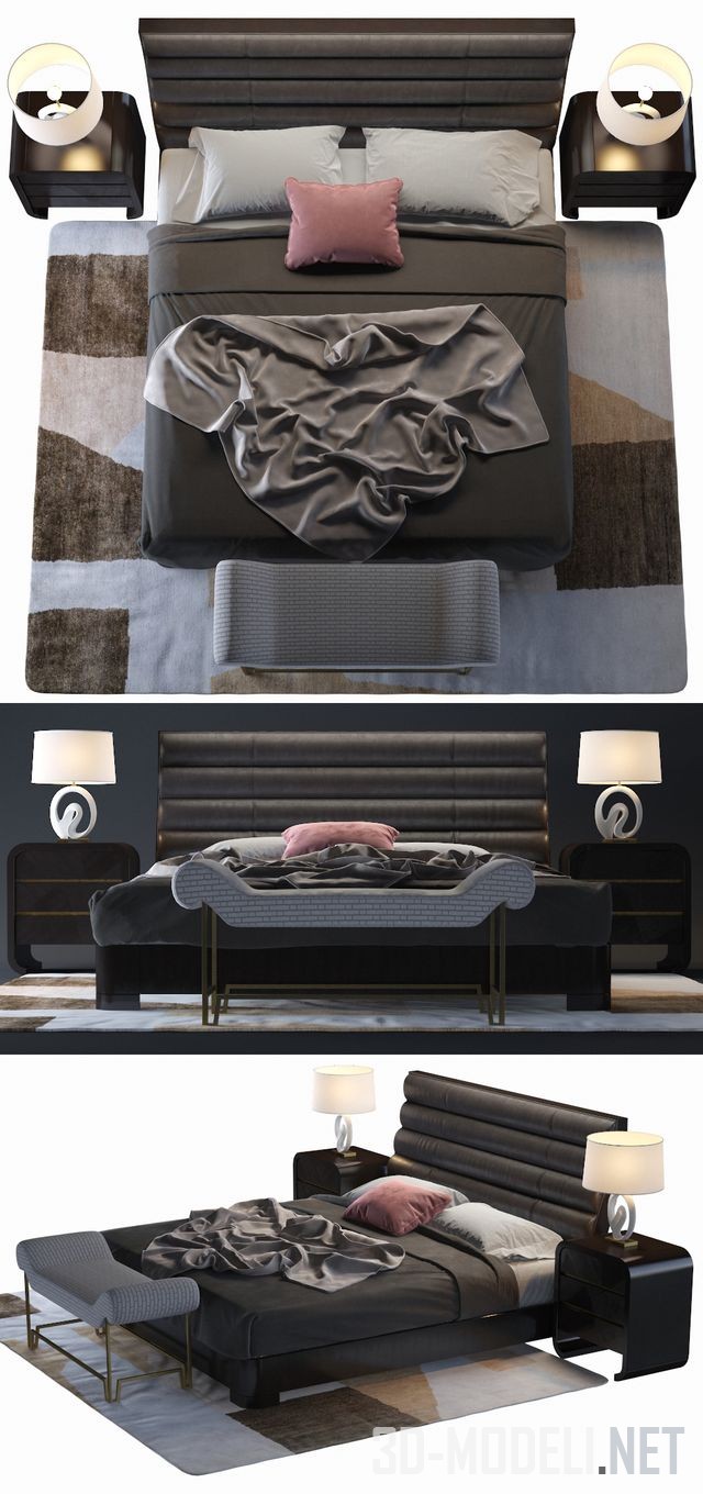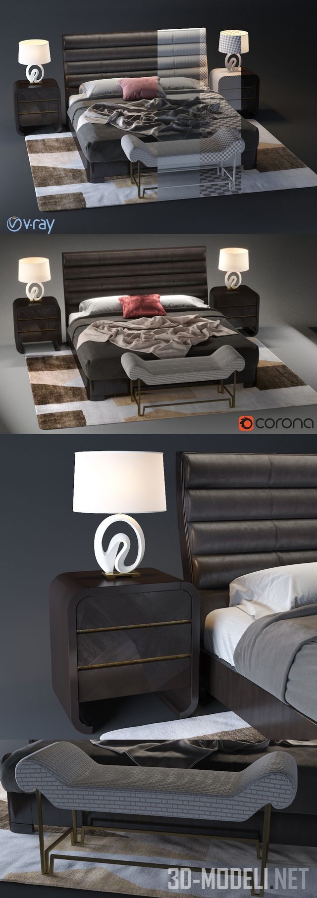 Мебельный набор для спальни в современном стиле, Baker JEAN-LOUIS DENIOT. В комплекте кровать Tashmarine (King) No. 3123K (размеры: 203.2 х 237.5 х 124.5), банкетка Iron eye bench No. 3117 (127 х 46.4 х 58.4 см), настольная лампа Chalcedony No. JLD103 (41.9 х 41.9 х 55.9 см), прикроватная тумба Labradorite No. 3109 (61 х 43.2 х 66.0 см) и ковер The Rug Company District Kelly Wearstler. Модель высокого качества, с материалами и текстурами в архиве.