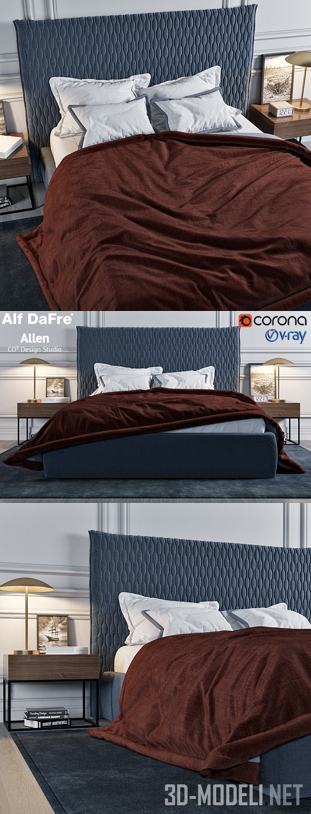 Изюминкой этой кровати Allen от Alf DaFre и CO3 Design Studio является мягкое сменное изголовье из текстиля приглушенного синего цвета, простеганное декоративным швом. Корпус кровати обтянут такой же тканью, но без прострочки. Постельное белье – белое. Одеяло – каштанового цвета. Прикроватные тумбы легкие, на тонких металлических черных каркасах. Выдвижной ящик в корпусе отделан светлым древесным шпоном. Настольные светильники на тонких ножках с непрозрачным «зонтом» рефлектора выполнены из золотистого металла. На тумбах – книги, электронные настольные часы, фотографии. Сцену дополняет ковер в цвет обивки кровати. Размер матраса кровати: 1550 х 2070 мм.
