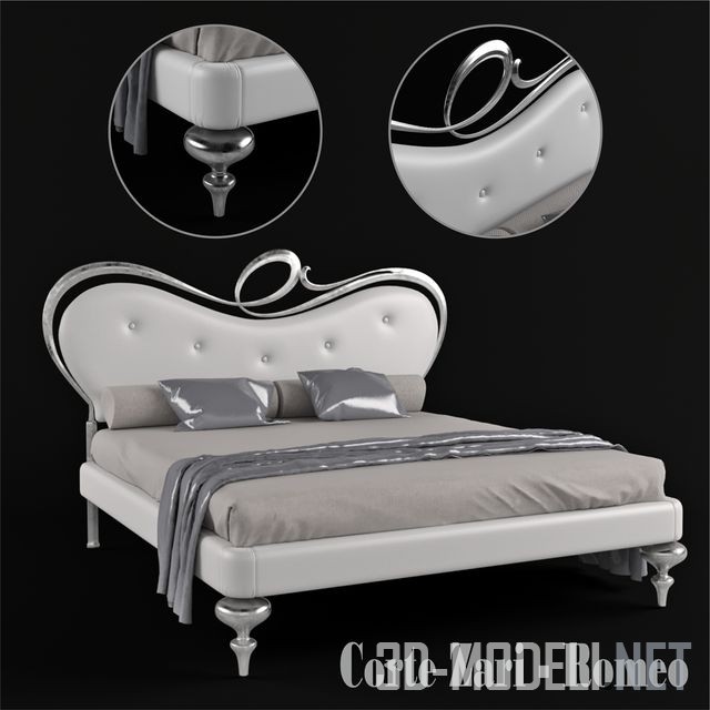 Кровать Romeo от Corte Zari, выполнена в стиле арт–деко. Мягкое фигурное изголовье декорировано втяжками и обрамлено черным глянцевым завитком. Точеные ножки кровати – тоже черные, глянцевые. Изголовье и корпус кровати обиты бархатом фиалкового цвета. Матрас и валик под подушками – серые. Чехлы на подушках и плед – фиолетово–серые.