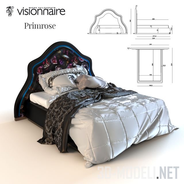 Оригинальная кровать из серии Primrose Visionnaire, фигурное изголовье которой, с роскошным цветочным принтом, сразу бросается в глаза и мгновенно создает нужный акцент в интерьере гламурной спальни. Размеры изголовья: 11 х 241 х 161 см. Размеры основания: 211.2 х 160.5 х 55.5 см. Постельное белье люкс-класс идеально подходит к дизайну кровати.