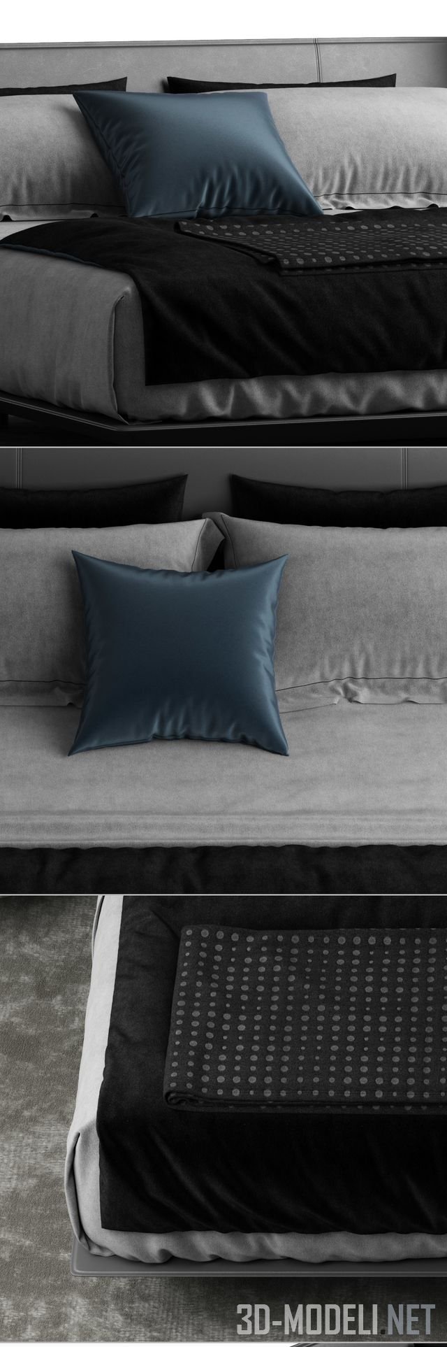 Современная кровать Alys Comp A от B&B Italia и пара прикроватных круглых столиков. Изголовье «парящей» кровати отделано черным, простроченным материалом. Постельное белье представлено в серо-черном с темно-синим сочетании. Каркасы столиков выполнены из хромированной полосы, что отлично сочетается с серыми мраморными разводами на круглых столешницах.
