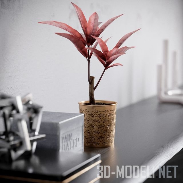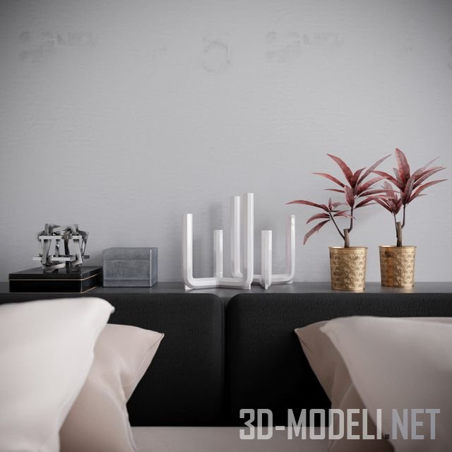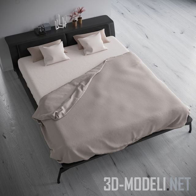 Rodolfo Dordoni. В изголовье кровати обустроена полка с аксессуарами из IKEA: пара золотистых цветочных горшков с цветами, подсвечники, шкатулки. Невысокая база кровати и изголовье собраны из плит графитового цвета. Ножки кровати черные, металлические. Постельное белье представлено в бежевом оттенке.