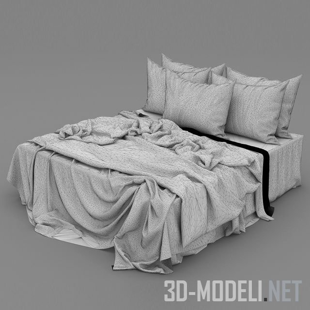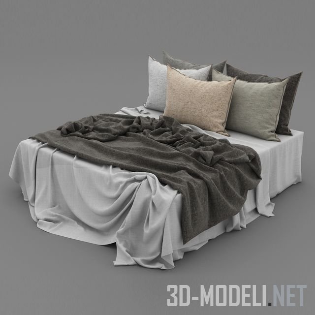 Кровать без спинки, основа для пяти подушек и светлого постельного белья, поверх которого лежит тонкий плед темного цвета. Реалистичная 3d модель для современного интерьера спальни.