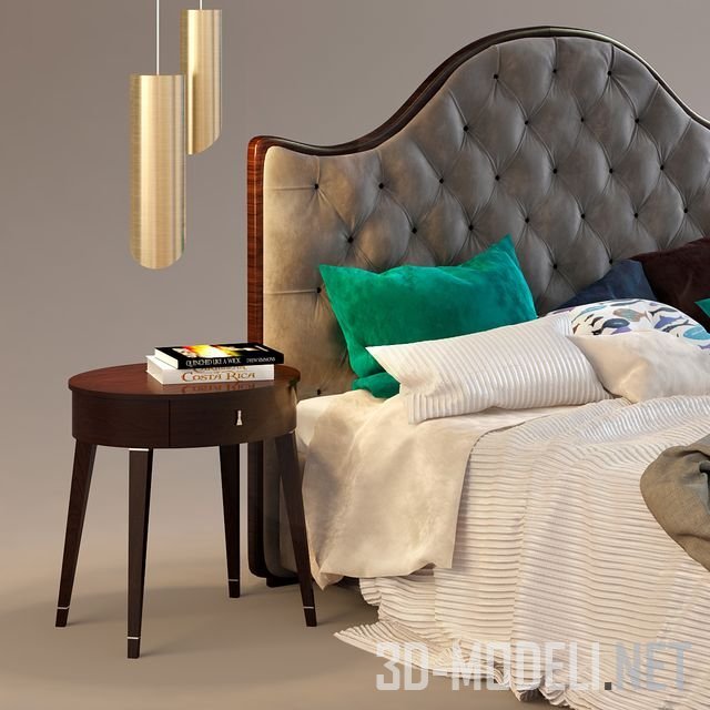 3d модель высокого качества, двуспальная кровать Onda (Codice: 2031, дизайн Tiziano Bistaffa, The Night Collection) и тумбочки Vendome (Codice: 5059, Lorenzo Bellini, The Night Collection). Размер: 66 х 55 х 68 см. В комплекте подвесные светильники, книги, ваза.