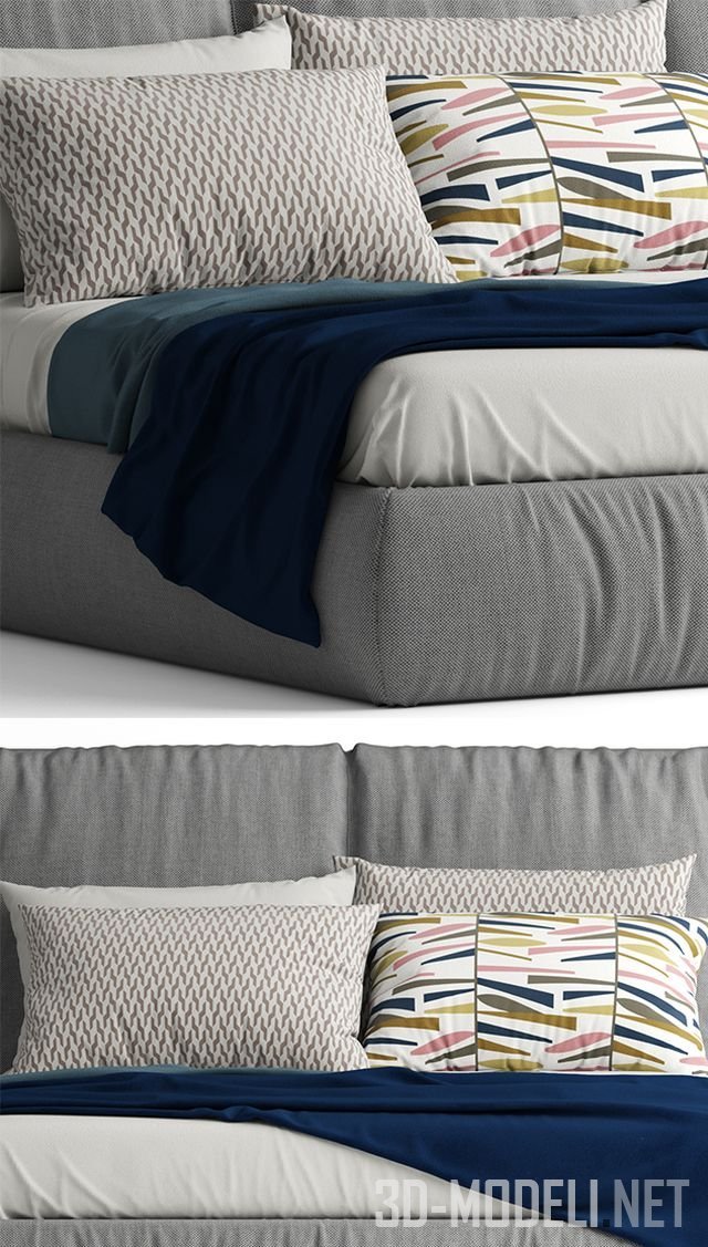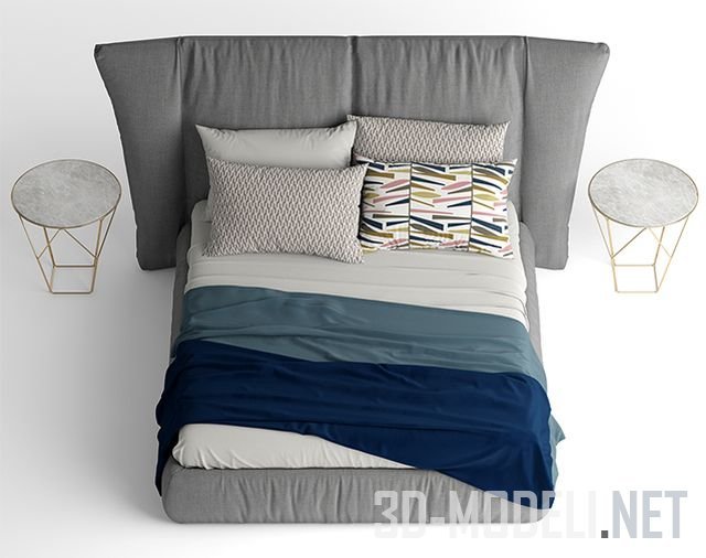 Красивая двуспальная кровать в серой обтивке, модель YOUNIVERSE от производителя Bonaldo. Дополнена одеялом, подушками, постельным бельем. В комплект входят прикроватные тумбы.
