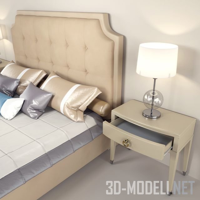 Красивая кровать в неоклассическом стиле, коллекция Modena от Fratelli Barri. Кровать из светлого дерева, имеет большое фигурное изголовье, которое обтянуто бежевой тканью и декорировано простежкой капитоне.