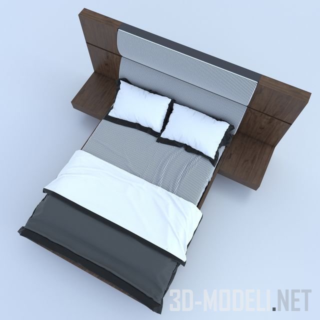 Двуспальная кровать коричневого цвета с ярко выраженной структурой дерева. Кровать имеет консольную, подвесную конструкцию. Дополнена постельным бельем белого и графитового цвета.