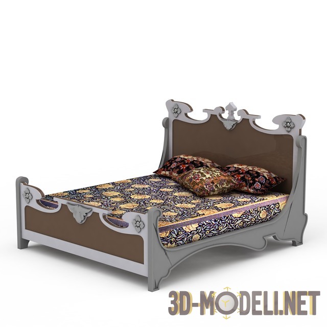 3D-модель двуспальной кровати с цветочным покрывалом. Кровать имеет резные декоративные элементы в изголовье и изножии, а покрывало с ярким цветочным принтом поддерживает общий стиль.