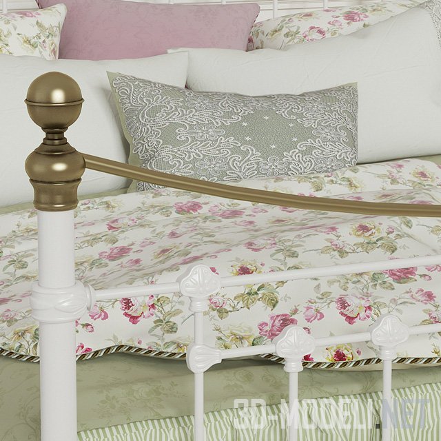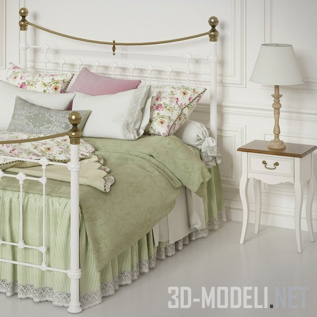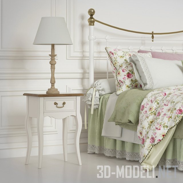 Чудесная кровать в стиле прованс, модель Victoria Stone White end Brass от производителя Julian Bowen. Размер кровати 163 х 207, высота 146 см. С золотыми шариками на спинке, кружевом на постельном белье и подушками в розочках, кровать смотрится очень романтично. На белой тумбочке с гнутыми ножками стоит настольная лампа с белым абажуром.