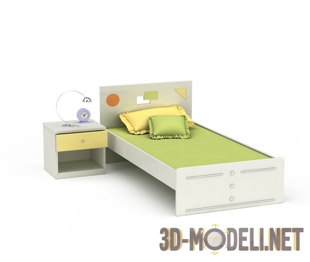 3D модель односпальной кровати. Игривый декор и жизнерадостная цветовая гамма делают эту односпальную кровать идеальной мебелью для комнаты подростка.