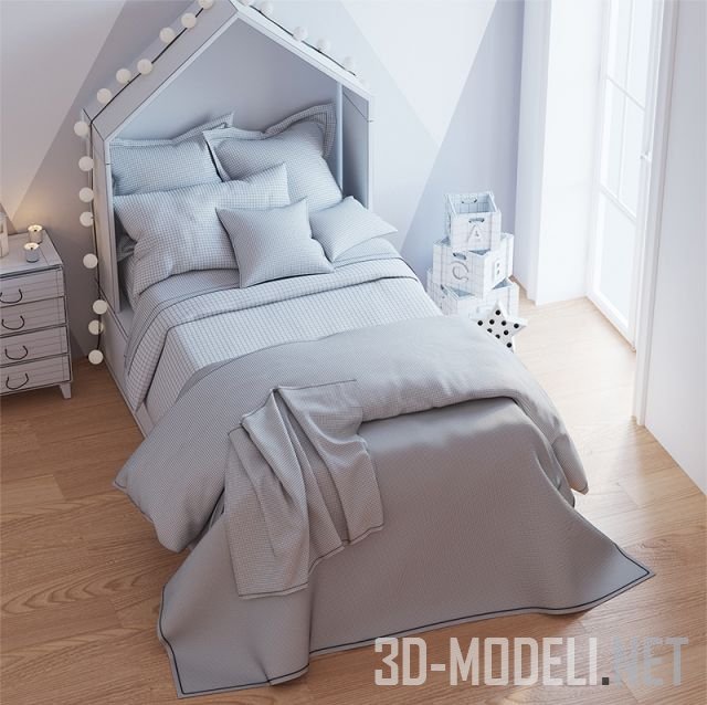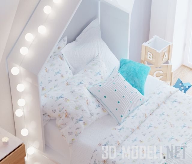 Пол, стена с покраской, кровать, подсвечник «Домик», свечи и гирлянда присутствуют.