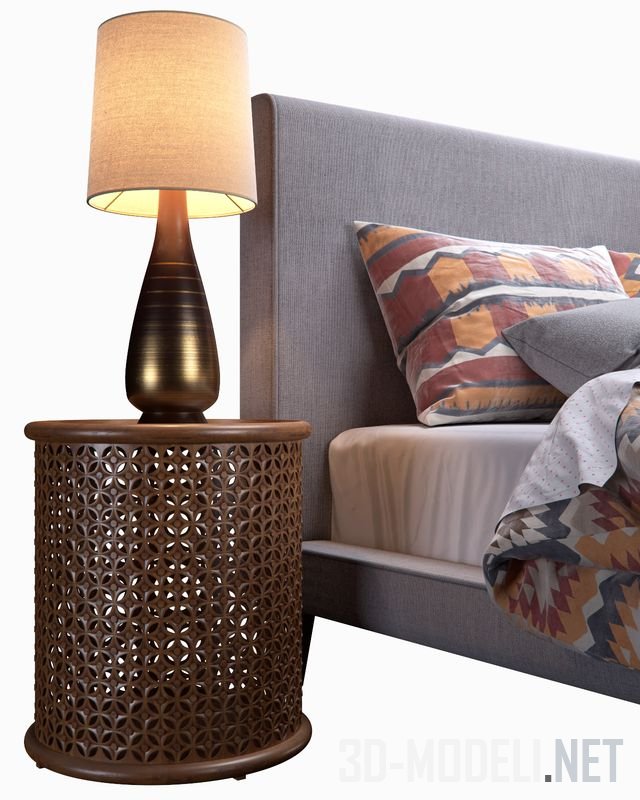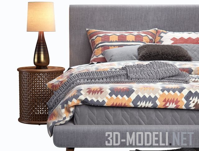 Качественная 3d модель двуспальной кровати с мягким изголовьем, Mod от West Elm. В комплекте присутствует плед, подушки, столик с настольной лампой.