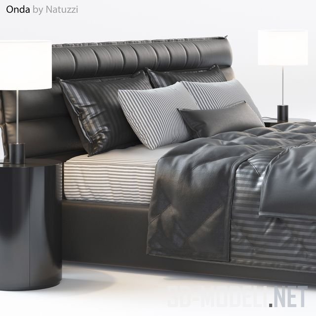 Удобная, современная двуспальная кровать с мягким изголовьем, модель Onda от производителя Natuzzi. 3D-модель изготовлена на высоком уровне, все текстуры присутствуют.
