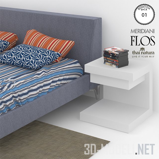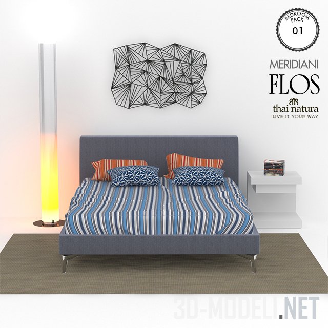 Современная кровать серого цвета от Meridiani, с полосатым постельным бельем. В комплекте торшером Flos и настенным декором thai natura кровать создает удачную комбинацию для спальни.