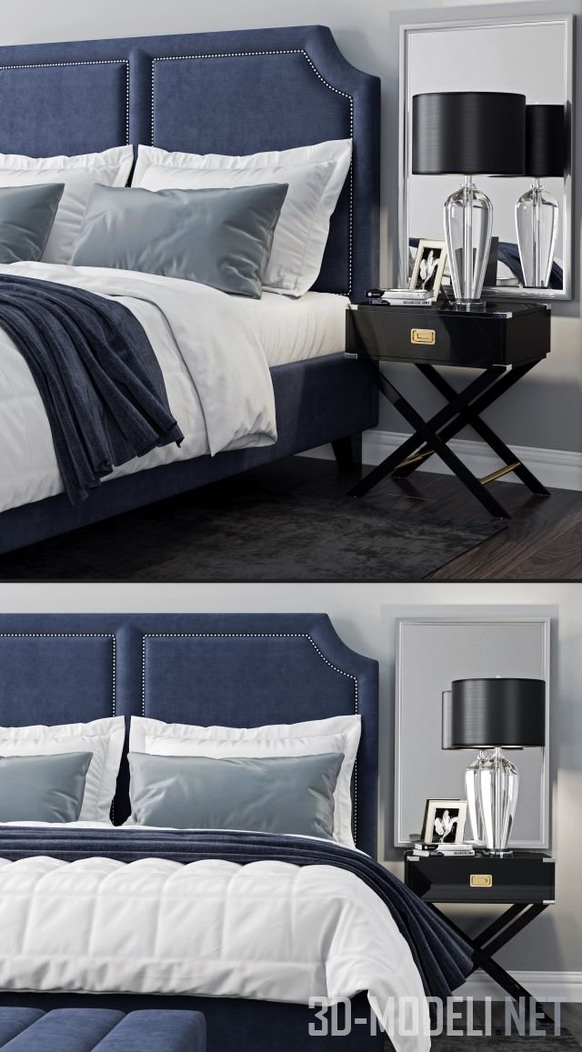 Двуспальная кровать с изголовьем Sanibel Queen от Mulhouse Furniture. В комплекте прикроватная тумба, настольная лампа, постельное белье, зеркало, ковер, книга, картина. Размеры кровати (в дюймах): 65 x 67 x 89.5 см.