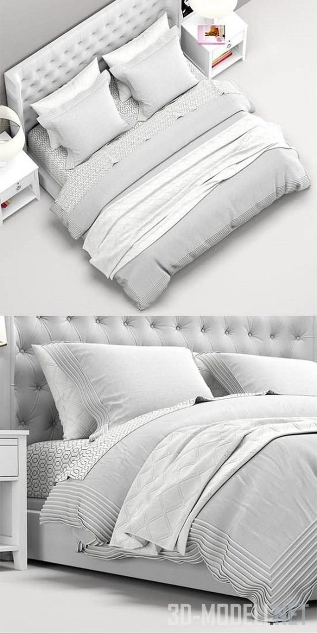 Кровать из серии RH Teen от бренда Restoration Hardware, модель Zadie Tufted. Высокая простеганная спинка делает кровать очень комфортной. В комплекте с прикроватными тумбами, настольными лампами и декором (фотографии, книги) модель смотрится очень реалистично.