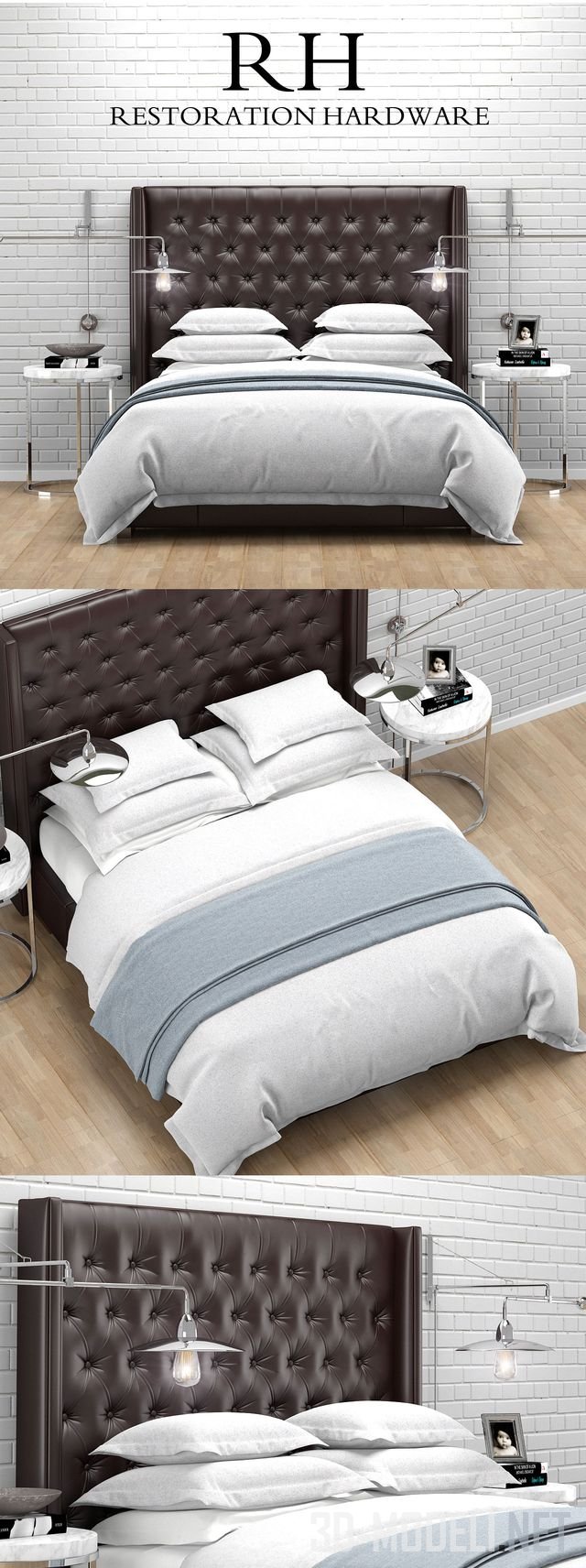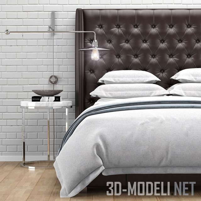 Двуспальная кровать с высоким кожаным изголовьем, простеганным в технике капитоне. Модель Adler от бренда Restoration Hardware. В комплекте постельное белье, подушки, декор.