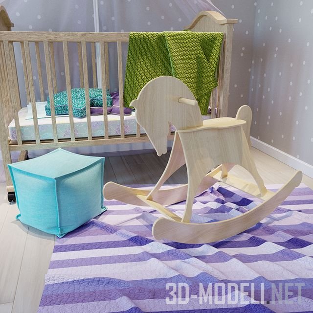 Детская кроватка из светлого дерева, размером 1300 х 700 х 1000 мм. Оснащена нежным полупрозрачным сиреневым балдахином и подвешенными к нему погремушками. Возле кроватки стоит голубой квадратный мягких пуф и фанерная лошадка-качалка.
